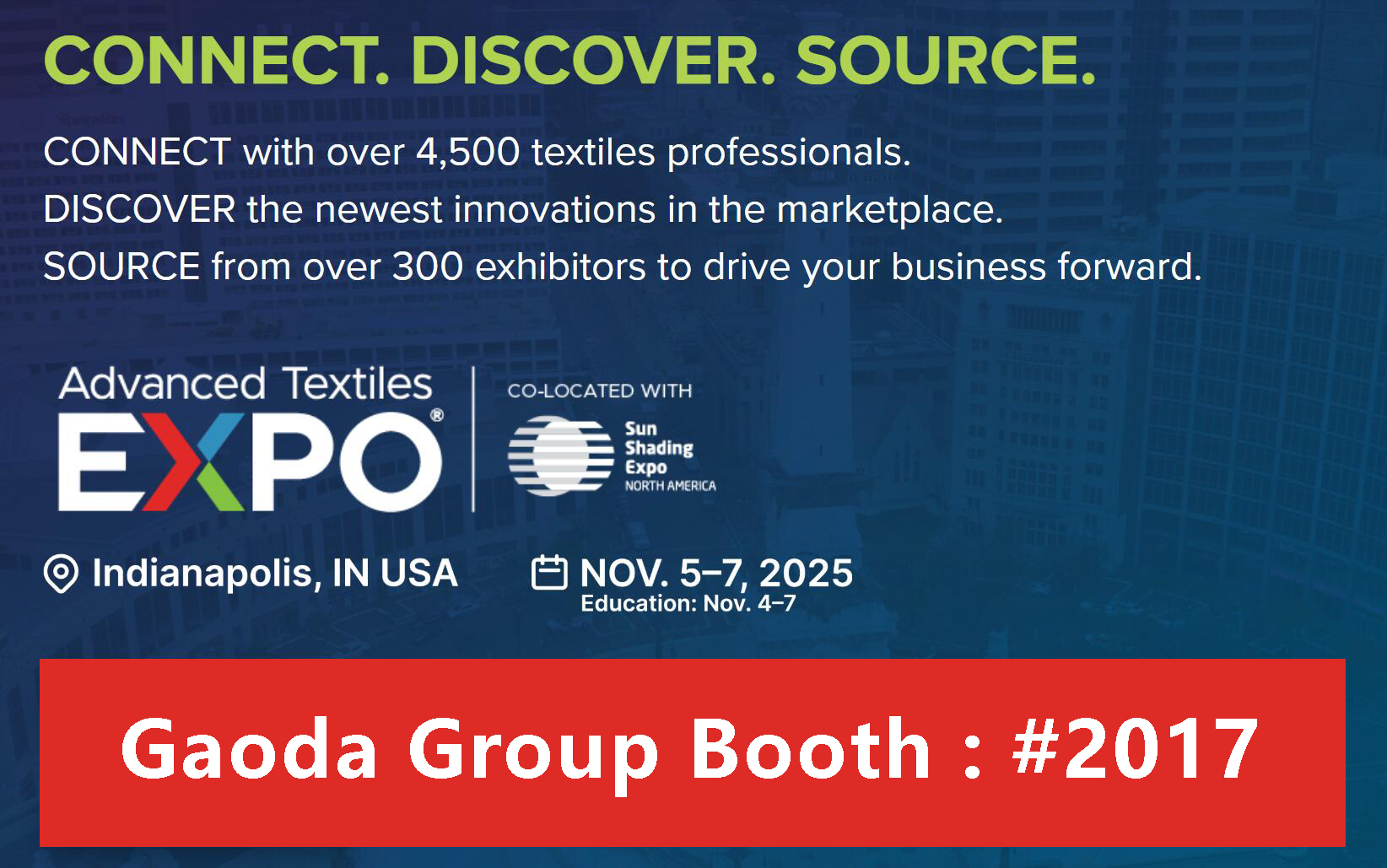 Gaoda Group примет участие в выставке AT Expo 2025, которая пройдет в Индианаполисе, Индиана, с 5 по 7 ноября. Как ведущий мировой производитель высокопроизводительных промышленных тканей, Gaoda Group продемонстрирует полный ассортимент материалов для покрытия ножей из ПВХ, сетчатых материалов, высокопроизводительных основовязальных промышленных тканей и экологически чистых изделий из переработанной натуральной кожи.